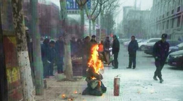 أضرم مزارع صيني النار في نفسه بوسط شارع مكتظ بالمارّة، بعد أن حنثت الحكومة بوعدها له بتعويضه عن أرضه التي استملكتها بهدف شق طريق سريع عبرها.