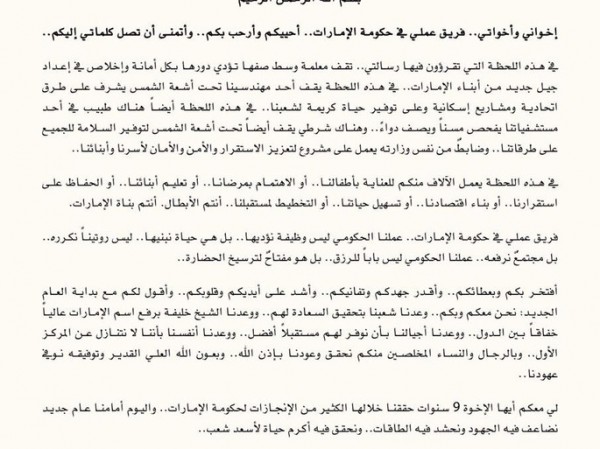 وقال الشيخ محمد بن راشد "أقدر جهودكم وتفانيكم، وأشد على أيديكم وقلوبكم، وأقول لكم مع بداية العام الجديد، نحن معكم وبكم".