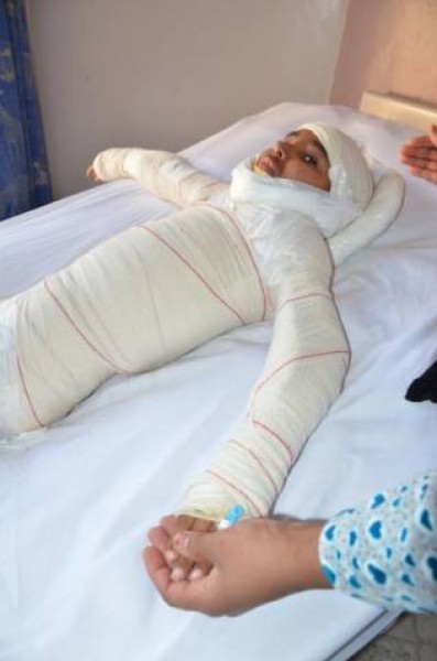 الطفل يحتاج علاجاً طويلاً ولازالت والدته تتبرع بجلدها بينما يرقد إسماعيل بجانبها وهو ملفوف دون حراك منذ أكثر من شهرين.