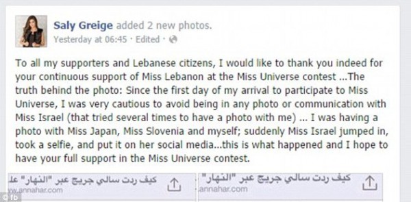 أوضحت ملكة جمال لبنان سالي جريج لبرنامج “حكي جالس” عبر الـLBCI ملابسات الصورة التي جمعتها مع ملكة جمال اسرائيل ، و ردت على الحملة التي طالتها بعد انتشار الصورة.