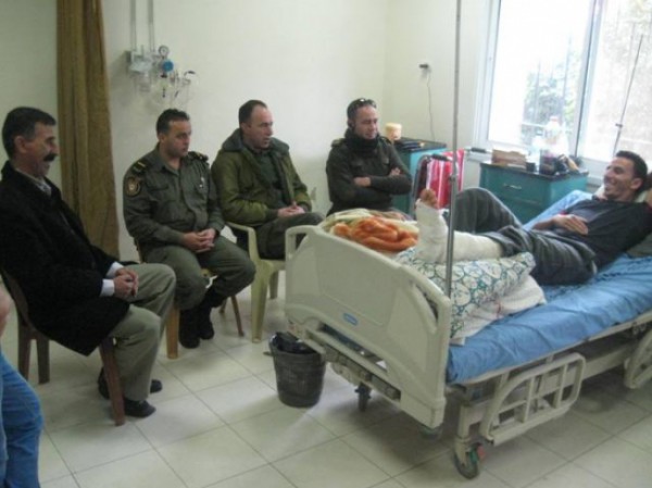 زار مجموعة من ضباط وصف ضباط من مكتب العلاقات العامة والإعلام لقوات الأمن الوطني الفلسطيني المواطن أحمد جربوع أحد الموظفين العاملين في مستشفى الشهيد خليل سليمان إثر إصابته برصاص قوات الإحتلال في قدمه اليسرى أثناء تواجده داخل مستشفى جنين الحكومي.
