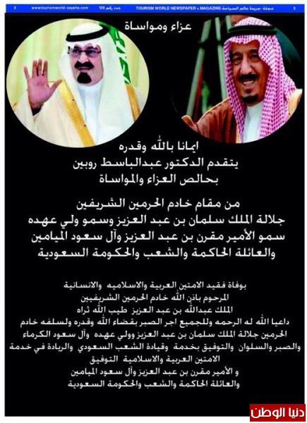 أعرب رجل الاعمال الدكتور عبدالباسط روبين أحد أعمدة السياحة والسفر بالأردن رئيس مجلس ادارة مجموعة شركات جبل النور السعودية الأردنية للسياحة والسفر والحج والعمرة ، عن خالص تعازيه ومواساته في وفاة خادم الحرمين الشريفين الملك عبدالله بن عبدالعزيز آل سعود ـ رحمه الله .