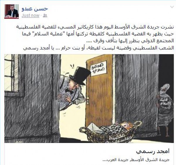 اثار كاريكاتور نشرته صحيفة الشرق الاوسط السعودية للفنان امجد رسمي , استياء الفلسطينيين على صفحات مواقع التواصل الاجتماعي فيسبوك .