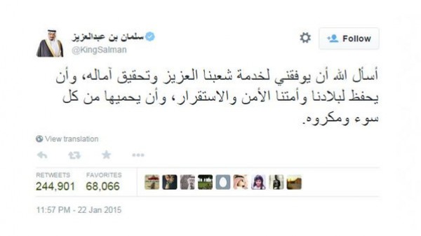 وفي أول تغريدة كتبها الملك سلمان بعد اعتلائه العرش يوم الجمعة الماضي، وقال فيها: "أسأل الله أن يوفقني لخدمة شعبنا العزيز وتحقيق آماله، وأن يحفظ لبلادنا وأمتنا الأمن والاستقرار، وأن يحميها من كل سوء ومكروه" نشط متابعوه، خصوصاً السعوديين المعتبرين الأكثر نشاطاً في "تويتر" بين العرب، بإعادة تغريدها، فيما وضعها 68164 متابعاً في خانة المفضلة لهم بالموقع الذي حوله السعوديون إلى منصة مبايعة "أون لاين" للعاهل السعودي.