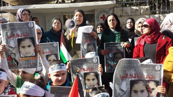 نظم الإتحاد العام للمرأه الفلسطينية فرع طولكرم اعتصاما نسويا حاشدا بمشاركة عدد كبير من المؤسسات الوطنية في المحافظة وعدد من الأطفال واهالي الأسرى امام الصليب الأحمر الدولي اليوم الثلاثاء للمطالبة بالإفراج الفوري عن الطفلة ملاك الخطيب ابنة قرية بتين والبالغة من العمر 14 عاما والتي تم اعتقالها في 31/12/2014 اثناء عودتها من مدرستها تحت حجج وذرائع واهية ، وكذلك للتضامن مع الأسرى الأطفال واسرى الحرية في سجون الإحتلال