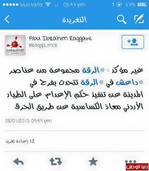 وكتب الرقاوي في تغريدته :"مجموعة من عناصر داعش في الرقة تتحدث بفرح من المدينة عن تنفيذ حكم الاعدام على الطيار الاردني معاذ الكساسبة عن طريق الحرق".