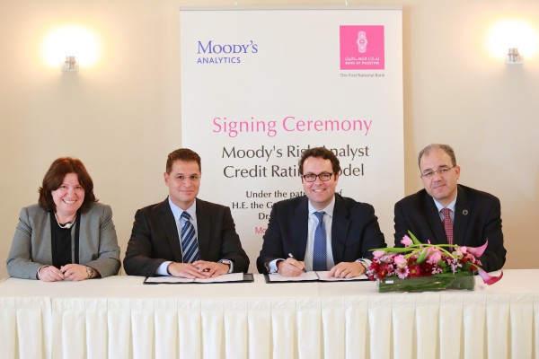 وقع بنك فلسطين اتفاقية هي الأولى من نوعها مع مؤسسة موديز العالمية لتقييم مخاطر الائتمان للشركات والمشاريع الصغيرة والكبيرة، والذي سيساعد البنك على المديين القريب والبعيد في اتخاذ القرارات المتعلقة بمنح التسهيلات الائتمانية للعملاء وتمويل المشاريع المختلفة في الوطن.