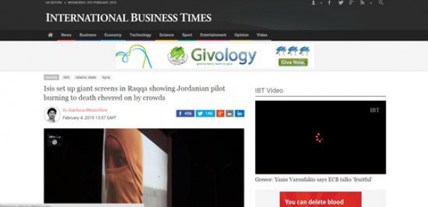 قام تنظيم داعش الإرهابى بعرض فيديو إعدام الطيار الأردنى "معاذ الكساسبة" محروقاً بالنار فى شاشات عملاقة، وزعها بأحياء مدينة الرقة السورية، التى تقع تحت سيطرته، مصورا ردود أفعال سكان المدينة وبينهم أطفال، وفقا لما نشرته الصحيفة البريطانية "بيزنيس تايمز".