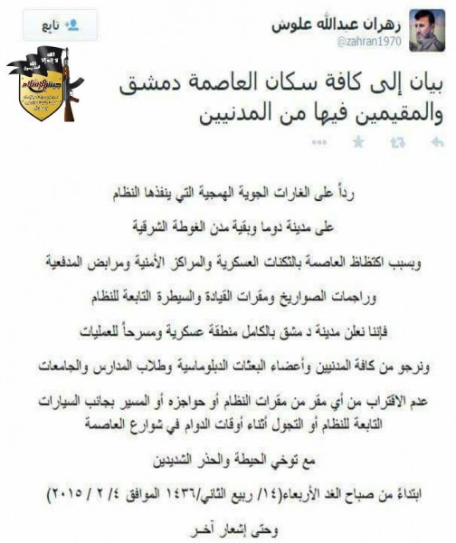 وقد جدد قائد "جيش الإسلام" إعلان العاصمة دمشق منطقة عسكرية، وجاء في بيان نشره علوش على حسابه في تويتر أن ذلك يأتي "ردا على الغارات الجوية الهمجية التي ينفذها النظام على مدينة دوما وبقية مدن الغوطة الشرقية"، وأضاف: "بسبب اكتظاظ العاصمة بالثكنات العسكرية والمراكز الأمنية ومرابض المدفعية وراجمات الصواريخ ومقرات القيادة والسيطرة التابعة للنظام، فإننا نعلن مدينة دمشق بالكامل منطقة عسكرية ومسرحا للعمليات".
