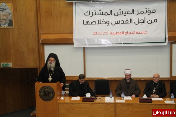 عقد في جامعة النجاح الوطنية مؤتمر العيش المشترك من أجل القدس وخلاصها في يوم الخميس 5|2|2015. وشارك في المؤتمر غبطة البطريرك ميشال صبّاح والمطران عطاالله حنا وفضيلة الشيخ الدكتور محمد الحاج محمد مفتي محافظة نابلس