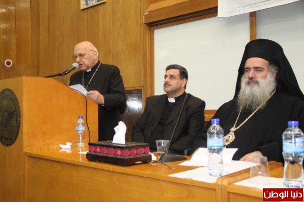وقد تحدث في هذا المؤتمر الذي عقد في القاعة الرئيسية في الجامعة تحدث كل من : غبطة البطريرك ميشيل صباح بطريرك اللاتين السابق في القدس ، وسيادة المطران عطا الله حنا رئيس اساقفة سبسطية للروم الارثوذكس ، وفضيلة الشيخ محمد الحاج