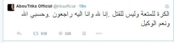 وكتب أبو تريكة، عبر حسابه على موقع التواصل الإجتماعى "تويتر"، "الكرة للمتعة وليس للقتل، إنا لله وإنا إليه راجعون، وحسبى الله ونعم الوكيل".