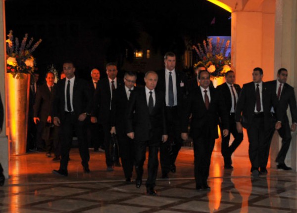 لحظة دخول الرئيسين فى الساعة 7 و40 دقيقة مساءً وقف الجميع تحية لهما وسط عاصفة من التصفيق الحاد تعبيرا عن التقدير والاحترام للضيف الكريم ووسط حضور مكثف من الوزراء وفى مقدمتهم رئيس الحكومة المهندس إبراهيم محلب، إضافة إلى عدد من الشخصيات العامة مثل الدكتور كمال الجنزورى وعمرو موسى والمهندس حسب الله الكفراوى ومحمد فايق والدكتور ميرفت التلاوى. وحضور المسئولين الروس وفى مقدمتهم سيرجى لافاروف وزير الخارجية الروسى الذى لقى ترحابا كبيرا من المسئولين المصريين وخاصة من السيد عمرو موسى وزير الخارجية الأسبق الذى تربطه علاقة جيده معه.