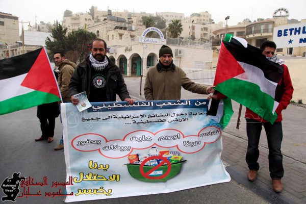 نظمت لجان المقاومة الشعبية لمقاومة الجدار والاستيطان وفصائل العمل الوطني الفلسطيني في محافظة بيت لحم اليوم وقفة لتعريف المواطن الفلسطيني بالمنتجات الاسرائيلية الستة التي تم الاعلان عن منع تداولها بالاسواق الفلسطينية، وقام النشطاء الفلسطينيون برفع الشعارات والاعلام الفلسطينية على جانب الشارع الرئيس المؤدي لمدينة بيت لحم كما قاموا بالصاق بوسترات وملصقات توضح المنتجات الستة التي تم منعها بهدف تعريف المواطن الفلسطيني بها .
