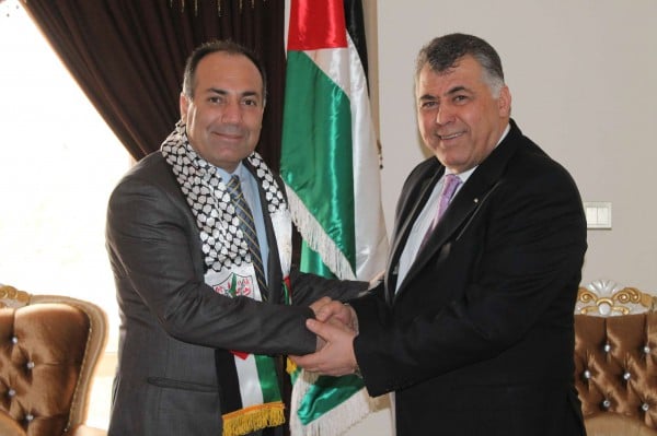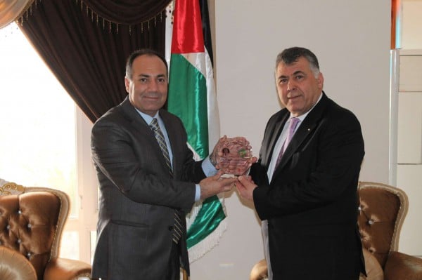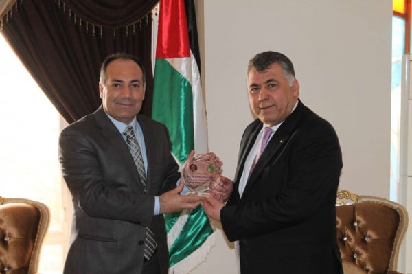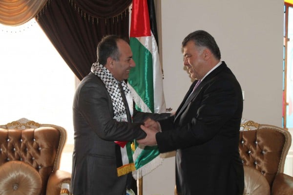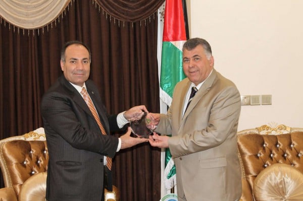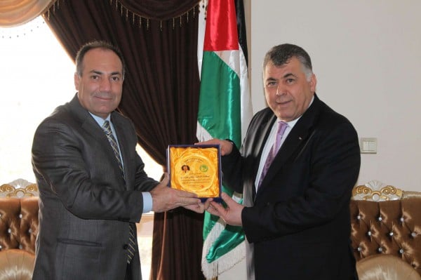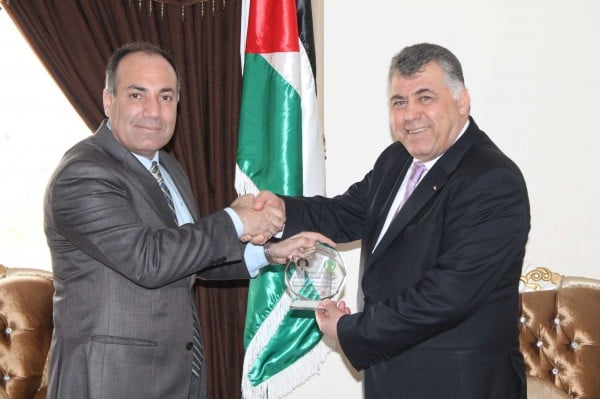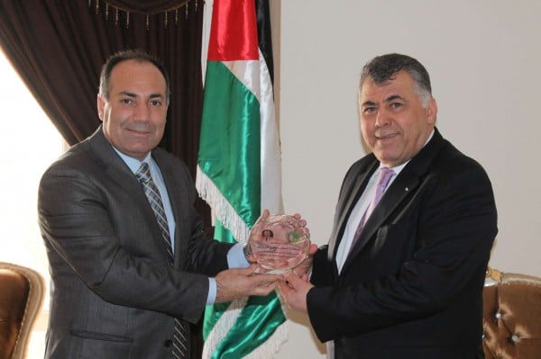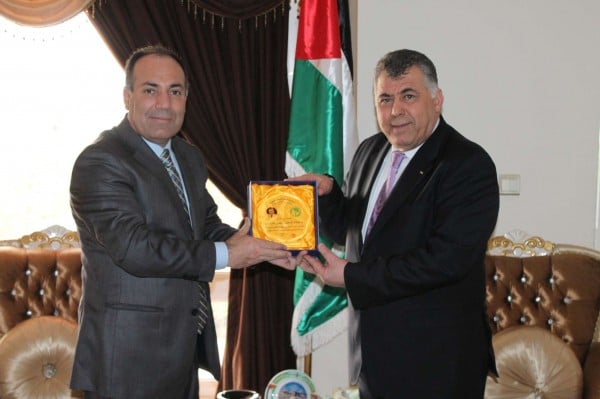 قدم المدير الاقليمي لمنظمة العاب السلام العالمية الدكتور عبدالحكيم عيسى نيابة عن الفرنسي السويسري الجنسية الدكتور ايف انجلو الرئيس المؤسس للمنظمة، والمرشح السابق للرئاسة الفرنسية، والمعروف دولياً بمواقفه الانسانية والمتضامنة مع الشعوب المضطهدة والمدافع الاول عن السلم والسلام العالميين بدرع تقدير من منظمة العاب السلام العالمية من جنيف، بمناسبة اليوبيل الذهبي لانطلاقة الثورة الفلسطينية، لمعالي سعادة السفير نظمي حزوري القنصل الفلسطيني العام في اقليم كوردستان العراق.