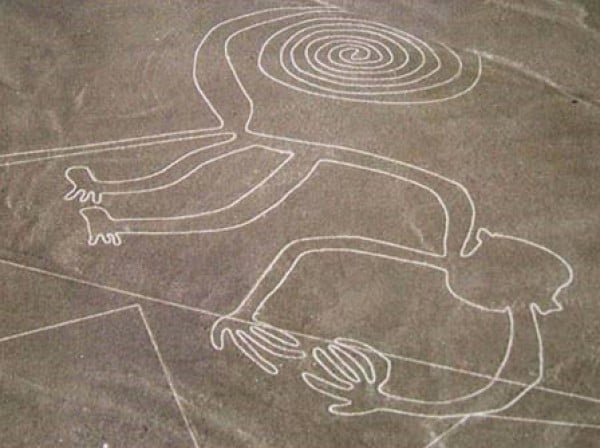 8- تقع خطوط نازكا في صحراء "نازكا" جنوب البيرو، وهي عبارة عن سلسلة من النقوش الصخرية القديمة، التي تغطي مساحة 450 كيلومترًا من الصحراء، وتجسد أشكالاً لحيوانات كالقرود والطيور والعناكب، وحيوانات اللاما والسحالي وأشكالا هندسية وأسطورية أخرى، ويبلغ عدد