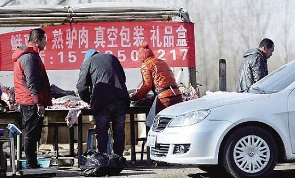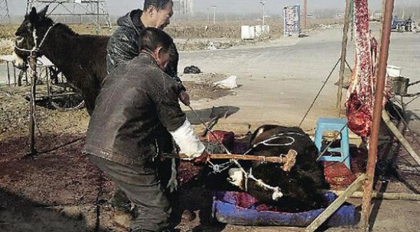 وأشارت صحيفة دايلي ميل البريطانية إلى أن الصور التقطت في مقاطعي هيبي شمالي الصين، ويظهر فيها مجموعة من الحمير مربوطة في الشارع، في الوقت الذي يثبت فيها رجل أحدها على الأرض، ويتولى آخر ضربها بالمطرقة إلى أن تفقد الوعى، ثم يستخدم سكيناً لقطع حنجرة الحمار قبل تقطيعه وبيعه للزبائن.