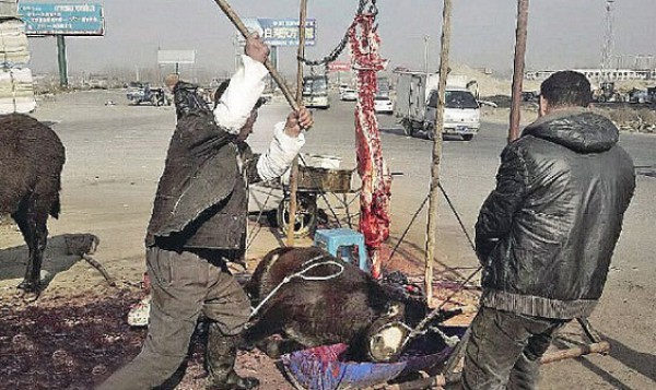 وتبين الصور التي تناقلتها وسائل الإعلام العالمية عدداً من الحمير تصطف على جانب الطريق، بانتظار تنفيذ حكم الإعدام بطريقة وحشية، من قبل الجزار الذي كان يقتل الحيوانات ويبيع لحومها مباشرة لسائقي السيارات المسافرين إلى مدنهم وقراهم للاحتفال برأس السنة الصينية الجديدة.