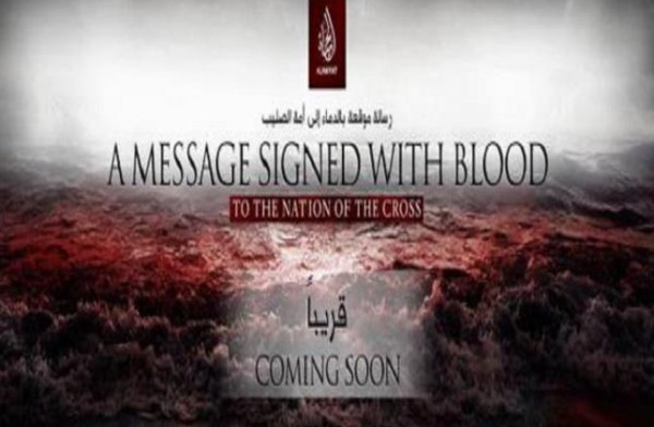 بثت حسابات تابعه لتنظيم ''داعش'' علي موقع التواصل ''تويتر''، اليوم الأحد، تغريدات توعد الحقت بها صوره لاصدار جديد من مقاطع فيديو تبثها ''مؤسسه الحياه'' التابعه للتنظيم بعملياته الارهابيه، دوّن عليها باللغتين العربيه والانجليزيه ''رساله الي امه الصليب.. قريبًا''، فيما يبدو انه اشاره الي المصريين المختطفين في ليبيا.