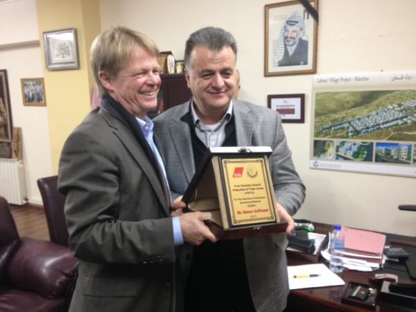 كما تناول الاجتماع عناوين التعاون النقابي المقترحة للمرحلة القادمة بين الاتحادين الألمانيوالفلسطيني في إطار دعم العمال والعاملات الفلسطينيين وبرامج وخطط منظماتهم النقابية.