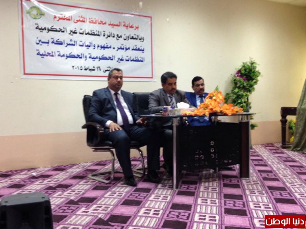 عقد في محافظة المثنى يوم الاثنين 16 شباط 2015 مؤتمر ( مفهوم و اليات الشراكة بين المنظمات غير الحكومية و الحكومة المحلية ) بحضور وفد من الامانة العامة لمجلس الوزراء دائرة المنظمات غير الحكومية مكون من السادة ابراهيم الجبوري معاون المدير العام و السيد عباس العطار مدير العلاقات و الاعلام و السيد سالم البديري منسق المنظمات في محافظة المثنى , و قد مثل السيد محافظ المثنى الاستاذ كريم سعد مستشار المحافظ لشؤون مؤسسات المجتمع المدني و حضر كذلك عدد من اعضاء مجلس محافظة المثنى و مدراء الدوائر و رؤساء و اعضاء المنظمات غير الحكومية في المحافظة .