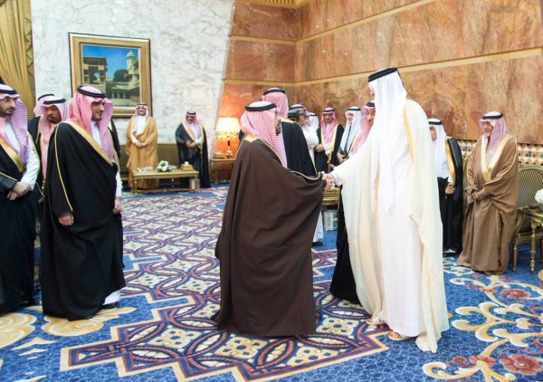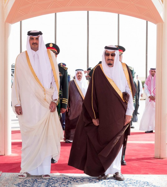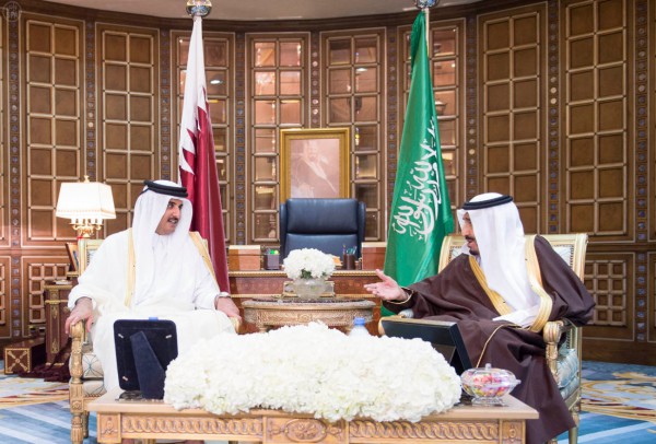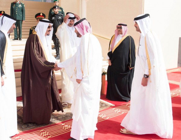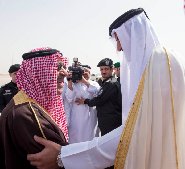فبعد أمير الكويت الشيخ صباح الأحمد الصباح، وولي عهد أبوظبي الشيخ محمد بن زايد، استضافت العاصمة اليوم أمير قطر الشيخ تميم آل ثاني مع وفد مرافق رفيع المستوى، واستقبله خادم الحرمين الشريفين الملك سلمان بن عبدالعزيز فور وصوله إلى مطار الملك خالد الدولي، وذلك بحضور ولي العهد الأمير مقرن بن عبدالعزيز، وولي ولي العهد الأمير محمد بن نايف.