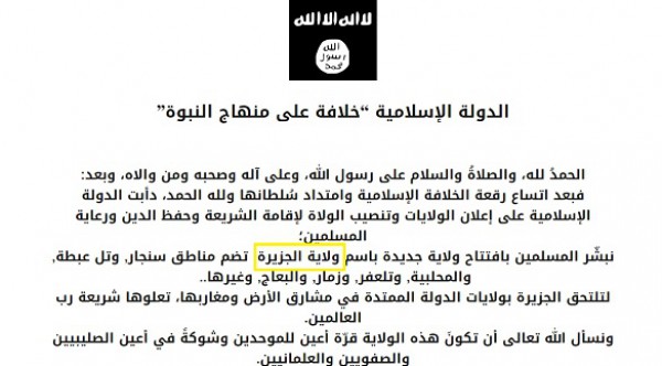 وجاء في البيان الداعشي الذي تم تداوله على موقع تويتر "بعد اتساع رقعة الخلافة الإسلامية وامتداد سُلطانها ولله الحمد، دأبت الدولة الإسلامية على إعلان الولايات وتنصيب الولاة لإقامة الشريعة وحفظ الدين ورعاية المسلمين، نبشّر المسلمين بافتتاح ولاية جديدة باسم ولاية الجزيرة، تضم مناطق سنجار، وتل عبطة، والمحلبية، وتلعفر، وزمار، والبعاج، وغيرها".