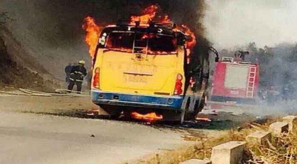 ويقول المتحدث باسم الشرطة: “محصلة الحافلة كانت واحدة من ثلاثة أشخاص أصيبوا بجراح، وأوقفت تشن الحافلة على الفور، وركض الركاب للنجاة بحياتهم ، فيما تفحمت الحافلة تمامًا”.