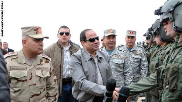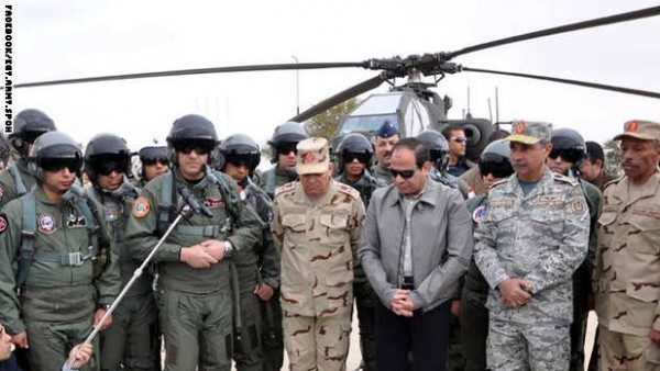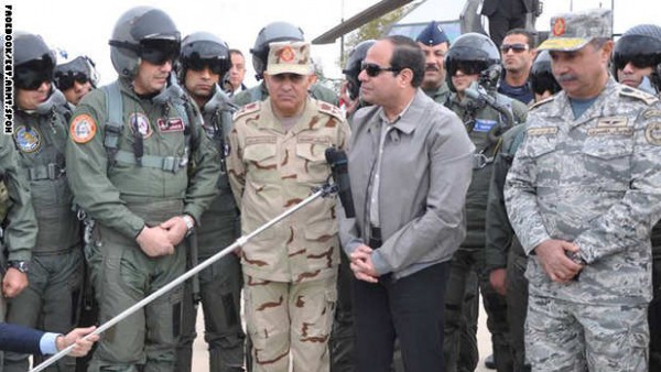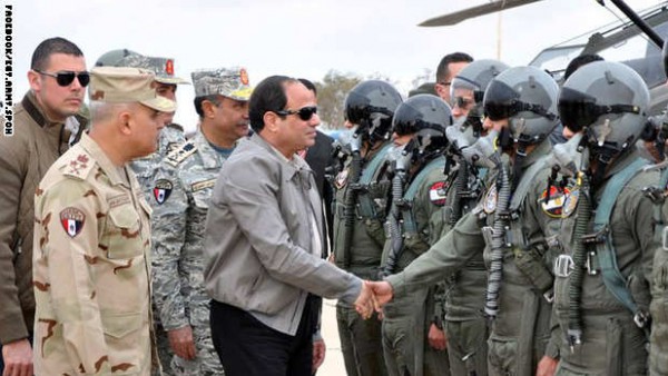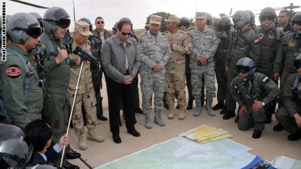التقى الرئيس المصري، عبد الفتاح السيسي، صباح الأربعاء عددا من الطيارين المصريين الذين شاركوا في توجيه الضربات الجوية لمعاقل تنظيم داعش في ليبيا، كما زار المنطقة الحدودية مجتمعا مع كبار رجال القبائل فيها للاطلاع على الأوضاع ميدانيا.