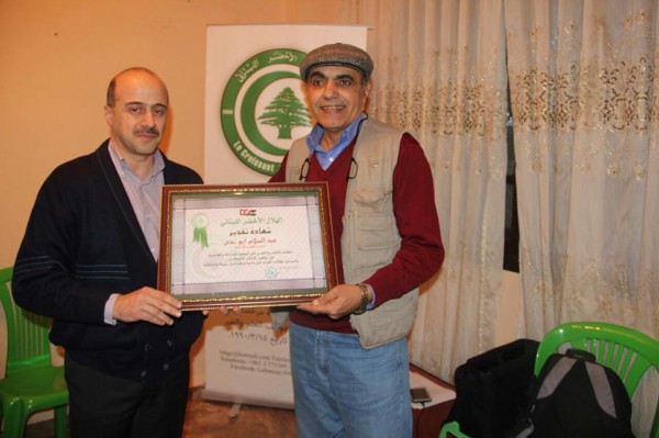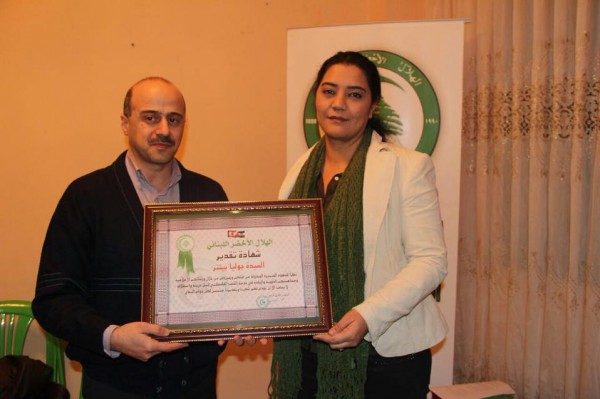 وكرم رئيس مركز الهلال الاخصر اللبناني طارق فاعور، الخبير الاعلامي عبد السلام ابو الندى و جوليا بيتنر مدير مشروع تعزيز الاعلام الفلسطيني المستقل والمدير الاقليمي لللانتر نيوز في الشرق الاوسط وشمال افريقيا استلمتها نيابة عنها فيدا ورده، بتقديم شهادة شكر وتقدير على الجهد الذي يبذلوه في سبيل تطوير