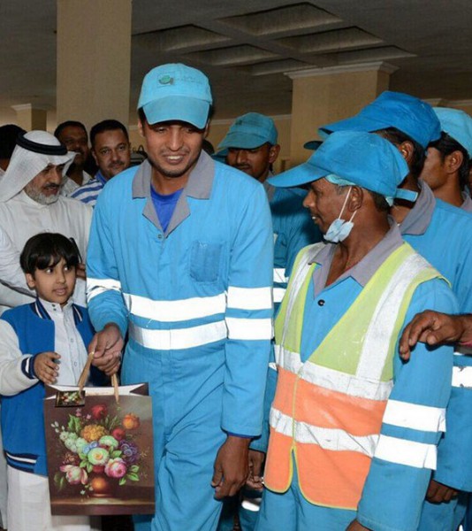 ويظهر في الصور التي نشرتها الصحيفة السعودية سعادة الطفل خلال توزيع الهدايا لعاملي النظافة في حين قال والده إنهم استجابوا لرغبة ابنهم الذي تعاطف مع العمال ودعاهم للحضور وتناول الغداء.