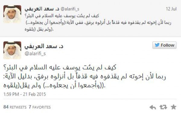 وفسر «العريفي» ذلك في تغريدة له على حسابه بموقع التواصل الاجتماعي «تويتر» قائلًا: «كيف لم يمُت يوسف عليه السلام في البئر؟ ربما لأن إخوته لم يقذفوه فيه قذفاً بل أنزلوه برفق، بدليل الآية: (وأجمعوا أن يجعلوه...) ولم يقل (يلقوه)».