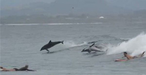 صغير الحوت يلعب مع اثنين من "الدلافين"