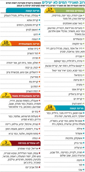 تم فحص 55 شركة مياه ومن بينها تبين أن هنالك 17 شركة استوفت معايير وشروط النجاعة وقد احتلت شركة مياه الجليل المكان السادس من بين الشركات الناجعة وتبين أن هنالك 18 شركة قامت بتجاوز قليل لهذه المعايير و 10 قامت بتجاوز كبير لمعايير النجاعة وأن 7 من هذه الشركات قامت بخرق خطير لهذه المعايير ووجد أن هنالك 3 شركات لم تستوفِ الشروط إطلاقًا.