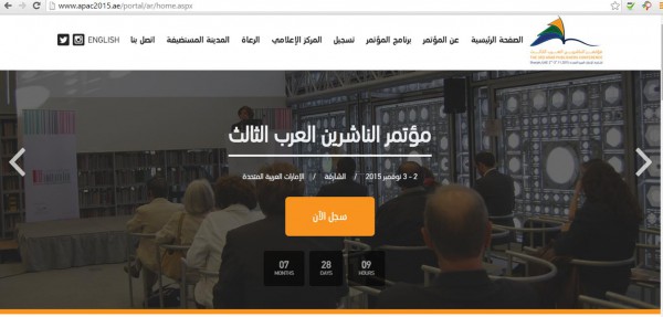 ويحتوي الموقع الإلكتروني للمؤتمر www.apac2015.ae على معلومات تفصيلية عن المؤتمر وبرنامجه، إضافة إلى فتح باب التسجيل لمشاركات الناشرين والمتحدثين، إضافة إلى معلومات عن اتحاد الناشرين العرب وجمعية الناشرين الإماراتيين، ومعلومات عن إمارة الشارقة وما تتضمنه من فنادق ومواقع سياحية. وسيتم تحديث محتويات الموقع باستمرار لتقديم معلومات تخدم مستجدات المؤتمر وبرامجه.