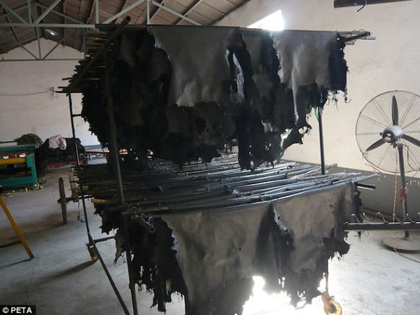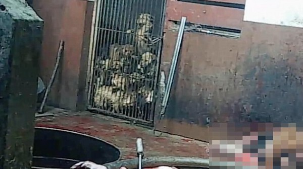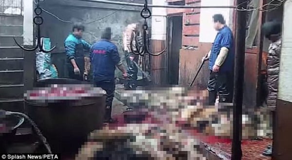 وأظهرت الصور أن الكلاب يتعرضون للضرب القاسي بالعصي حتى موتهم ثم يعلقون ويسلخ جلدهم.