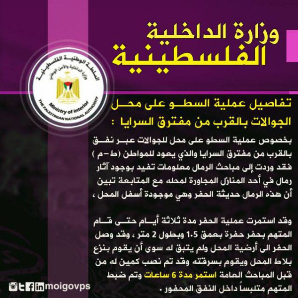 بخصوص عملية السطو على محل للجوالات عبر نفق بالقرب من مفترق السرايا والذي يعود للمواطن (ط-م ) فقد وردت إلى مباحث الرمال معلومات تفيد بوجود آثار رمال في أحد المنازل المجاورة لمحله مع المتابعة تبين أن هذه الرمال حديثة الحفر وهي موجودة أسفل المحل ،