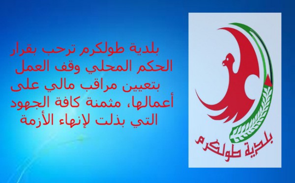 وكان خالد اشتية مدير الحكم المحلي في طولكرم قد سلم رئيس البلدية قرار وزير الحكم المحلي بوقف العمل بقرار تعيين مراقب مالي على أعمال البلدية وذلك بعد اقرار جملة من التفاهمات المتعلقه بمديونية الكهرباء والتزام البلدية بتسديد الفواتير الشهرية وفق النسبة التي اتفق عليها.