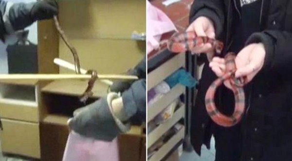 استطاع شرطيان روسيان أن يسيطرا على الأفعى ذات اللون الأسود والأحمر، بعد أن عثر عليها عمال التنظيف في كومة من الغسيل القذر.