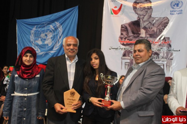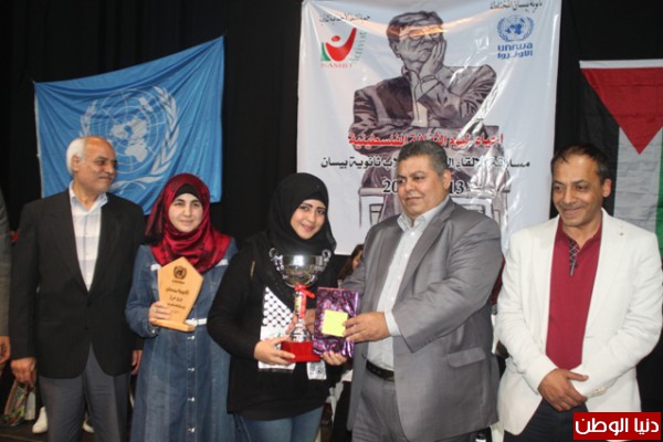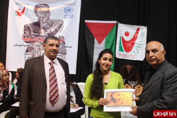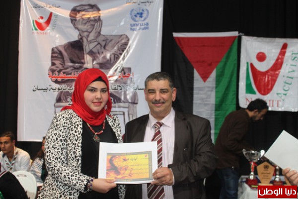 ثم قدّم كلّ من السيّد ماهر مشيعل المسؤول الثقافي والإعلامي في سفارة دولة فلسطين، وعدد من أساتذة ثانوية بيسان والسيّد ظافر الخطيب المدير العامّ لجمعيّة ناشط الإجتماعيّة الثّقافيّة الجوائز على الفائزين وشهادات التقدير على كافّة المتسابقين.