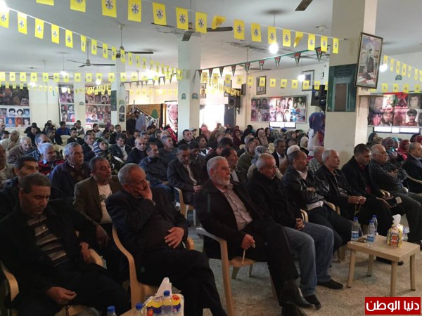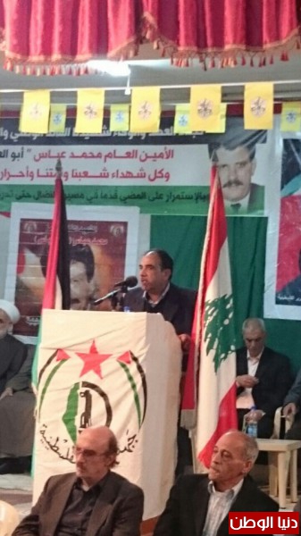 وفي ختام المهرجان ألقى عضو المكتب السياسي لجبهة التحرير الفلسطينية كلمة قال فيها في البداية اتقدم باسمى ايات التعازي من عائلة فقيد الشباب المرحوم فراس دحويش ونحن نأسف لما جرى من سؤ فهم اثناء الختمة والمهرجان ، ونعتبر المرحوم هو خسارة لشعبنا ، ونقول تغمد الله الفقيد بواسع رحمته واسكنه فسيح جناته ، وحيا الحضور وقال نقف وإياكم اليوم بقلوب منحنية وهامات شامخة احترامًا وإجلالاً لمن كان قد لخص معنى الانتماء الحقيقي للوطن وأغمض عينيه على رسم فلسطين, الوطن, الهوية, القضية، انه القائد الوطني والقومي والأممي الكبير الامين العام لجبهتنا أبو العباس ، الذي تشبع بعشق الوطن، وتملكه حلم العودة، فكان همه الوحيد وشغله الشاغل مع رفاقه القادة سعيد اليوسف وابو العز الوصول الى ارض الوطن لتحقيق الاشتباك المباشر مع العدو، ولأجل ذلك ابتدع الوسائل التي مكنت المقاتل الفلسطيني من الوصول الى غايته المنشودة عبر البر والجو و البحر، ولأنه أدرك مبكرا أن الاحتلال الذي هجر شعبنا عن أرضه عبر المجازر الوحشية، وأمعن في قتل شعبنا ومارس بحقه أبشع أنواع الظلم والتعذيب داخل السجون ومعسكرات الاعتقال والتنكيل بحقه لا بد من زواله عن ارض فلسطين ، واضاف لقد وصفه الرئيس الشهيد الرمز ياسر عرفات بكلمة في احدى المجالس الوطنيه وهو ينادي الامناء العامين بالاسم ايها الاخ الحبيب ابو العباس ايها المقاتل الشرس ، لأن ابو العباس كان مندفعا بإيمانه بعدالة قضيته وضرورة تحريرها من أسر السياسات العربية الرسمية والمساومات الدولية زمن الحرب الباردة، كان يحاول أن يخرج القضية الفلسطينية من سجنها العربي الرسمي كما من سجنها الدولي القائم على توازن القوى بين المعسكرين المتصارعين، واضاف من مخيم الشهداء نحيي كافة شهداء الجبهة قادة ومناضلين وفي مقدمتهم الامناء العامون العظام ابو العباس طلعت يعقوب وابو احمد حلب والقادة سعيد اليوسف وابو العز وحفظي قاسم وابو العمرين وجهاد حمو ومروان باكير وشهداء الثورة الفلسطينية في طليعتهم الرئيس ياسر عرفات والقوى الوطنيه والاسلامية اللبنانية وحركة التحرر العربية والعالمية وفي مقدمتهم الرئيس الفنزويلي تشافيز الذي يستحق منا جميعاً وردة حب ، كما نتوجه بالتحية والوفاء للامام المغيب السيد موسى الصدر الذي كان يقول ان السند الحقيقي للثورة الفلسطينية هو عمامتي ومحرابي ومنبري، معتبراً ان القبلة يجب ان تكون وتبقى فلسطين بقوله إن العودة الى فلسطين هي صلاتنا وإيماننا ودعاؤنا نتحمل في سبيلها ما نتحمل ونتقرب الى الله في سبيلها بما نتحمله من متاعب، وثمن قرارات المجلس المركزي الفلسطيني في دورته الاخيرة واكد دعم الجبهة لتوجه القيادة الفلسطينية الى محكمة الجنايات الدولية، من اجل نقل ملف جرائم الإحتلال، من حصار جماعي، واستيطان، وقتل للمدنيين العزل واغتيال القادة الشهداء لمقاضاة قادة الاحتلال على جرائمهم ، وهذا يستدعي من الجميع العمل الحثيث لاستعادة الوحدة الداخلية وانهاء الانقسام الكارثي وإعتماد سياسة كفاحية في الميدان في إطار إستراتيجية شاملة في صلبها وفي القلب منها المقاومة الشعبية، وتوسيع دائرة الإعتراف بالدولة الفلسطينية، وبالحقوق الوطنية المشروعة لشعبنا في العودة والحرية والاستقلال، ودعا الى حماية المشروع الوطني ، لأن من يحاول الانتقاص من هذا المشروع والثوابت يرتكب جريمة وطنية لا يمكن السكوت عنها، ونحن نقول بكل وضوح لا يمكن لأي فصيل مهما كبر شأنه، أن يكون بديلا عن منظمة التحرير الممثل الشرعي والوحيد، ولا يمكنه تجاوز الثوابت الوطنية الفلسطينية، ونؤكد لكم ان من يخرج عن الاجماع الوطني الفلسطيني يرتكب جريمة تساوق مع مخططات الاحتلال الاسرائيلي ومشاريعه التصفوية، ونحن نحذر من مخطط فصل القطاع عن الضفة هو مشروع قديم طالما سعت اسرائيل اليه ، لأن فصل القطاع يمثل نسفاً للمشروع الوطني وتفريطا بالثوابت الوطنية، وتطرق الى ما يجتاح المنطقة برمتها،من هجمة امبريالية "صهيونية" وارهاب 
