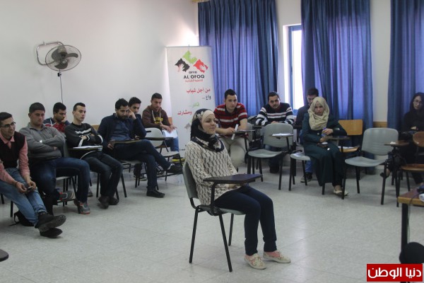 عقدت مؤسسة الافق للتنمية الشبابية بالتعاون مع دائرة العلاقات العامة في جامعة النجاح هذا اليوم السبت الموافق 14-3-2014 ورشة عمل شارك بها 48 طالب/ة من مختلف الكليات والتخصصات .