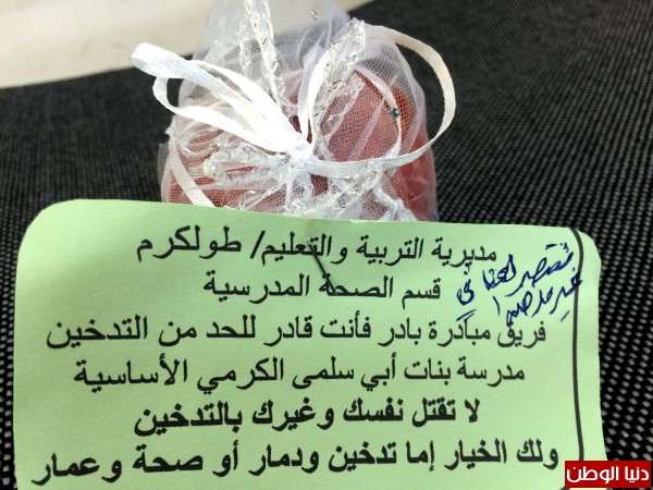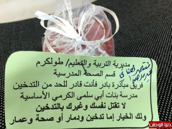 مبادرة قامت بها بروعة بنات مدرسة ابي سلمى الكرمي س بمشاركة آلاء اليحيى من قسم الصحة المدرسية ومنسقة اللجنة الصحيه في المدرسة فاطمة سلامة في مبادرة تحت عنوان حارق للسيجارة إذا اتعظ المدخنين لسلامتهم وصحتهم (بادر فأنت قادر للحد من التدخين ) ولا تقتل نفسك وغيرك بالتدخين ولك الخيار إما التدخين ودمار إو صحة وعمَارْ .