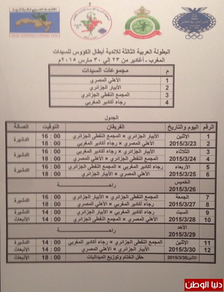 ومن الجدير بالذكر ان بطولة السيدات الثالثة ستنطلق يوم الاثنين القادم بمشاركة اربعة اندية هى الابيار والمجمع النفطى الجزائرى والأهلي المصري بالاضافة الى المستضيف رجاء أغادير المغربي وستقام البطولة بنظام الدوري من دورين.