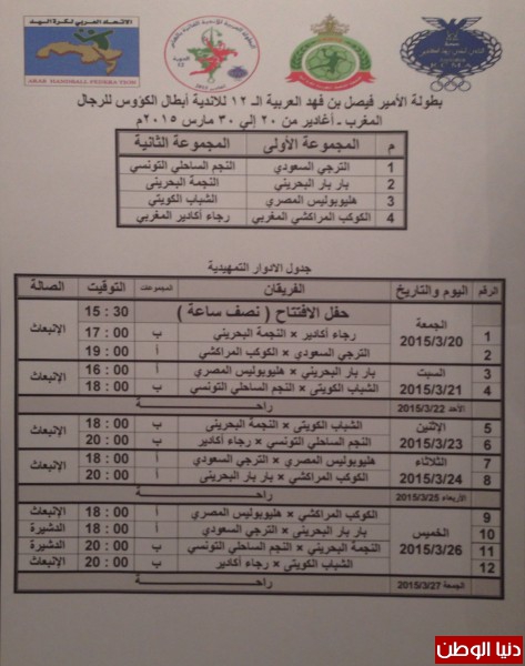 عقدت اللجنة الفنية بالاتحاد العربي لكرة اليد في الساعة العاشرة من مساء اليوم بتوقيت المغرب الاجتماع الفني الذي يسبق افتتاح البطولة العربية الثانية عشر ابطال الكؤوس التي ستنطلق عصر اليوم ( الجمعة )على صالة الانبعاث بمدينة اغادير المغربية وحتى ٣٠ من الشهر الجاري. وتم خلال الاجتماع اعادة توزيع المجموعات بعد اعتذار فريق الترجي التونسي، ليحل الترجي السعودي في المجموعة الاولى الى جوار كوكب المراكشي والذي سيلعب معه اولى لقاءاته في الساعة العاشرة بتوقيت المملكة، اضافة الى فريقا باربار البحريني وهليوبوليس المصري. وضمت المجموعة الثانية المنظم فريق رجا اغادير الذي اختار مواجهة فريق النجمة البحريني في الافتتاح، اضافة الى فريقا الشباب الكويتي والنجم الساحلي التونسي.