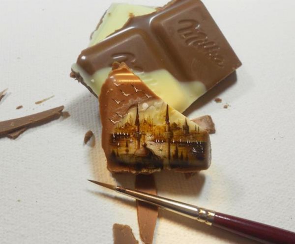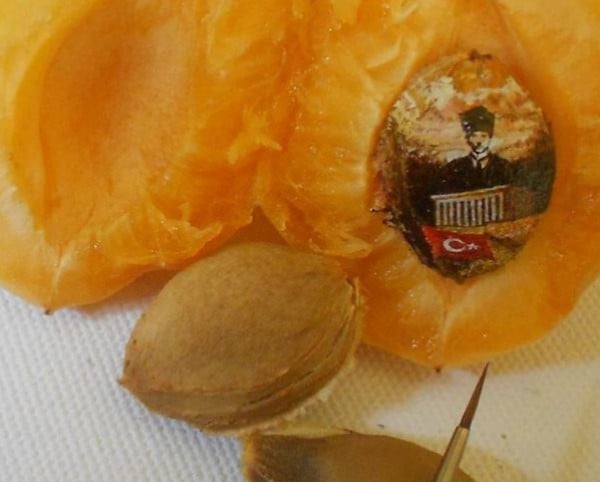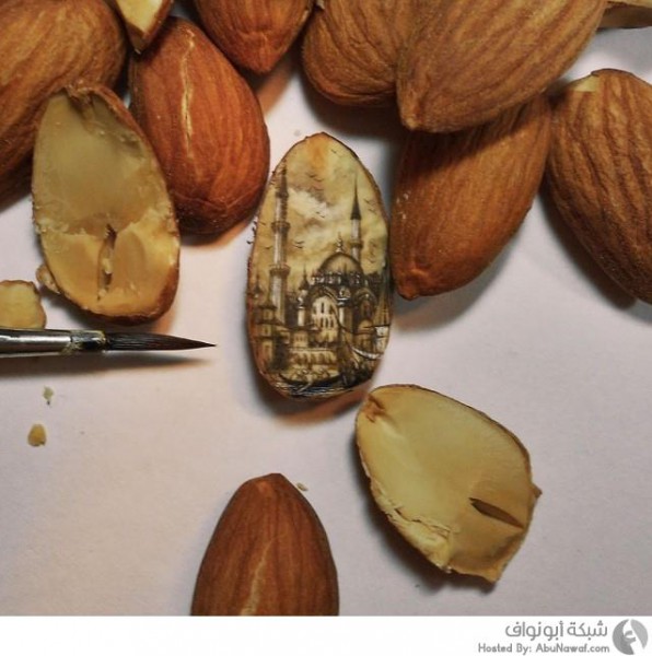 يقوم الفنان التشكيلي التركي حسن كالي بانتاج اعمال فنية رائعة بالرسم على اسطح المكسرات (كحبات اللوز) والحبوب وقطع الشوكولاتة وحتى الفاكهة (كحبات الكرز) صانعا لوحات زيتية جميلة بالغة الدقة.