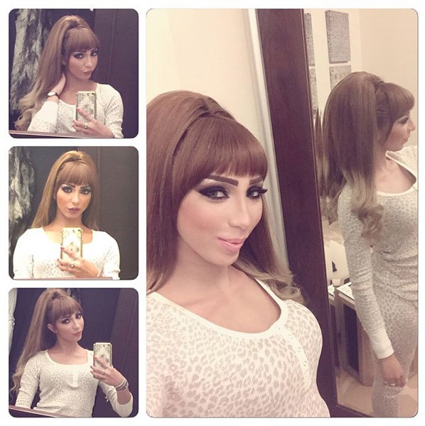 الفنانة المغربية ظهرت في الصور بمكياج قوي وعملت غرة كثيفة من الأمام، منحتها إطلالة عرائس «باربي» الشهيرة.