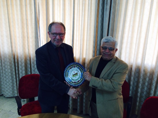استقبل الأستاذ الدكتور أحمد العطاونة، رئيس جامعة الخليل، وفداً أكاديميا ألمانيا من جامعتي كولن و مونستر يضم كل من البروفيسور جوزيف فرايزه من جامعة كولون و دانييال روترز و فراوتي دوبر من جامعة مونستر وذلك بحضور الدكتور سامي عدوان، نائب رئيس الجامعة للشؤون الأكاديمية، والأستاذ محمد زياد الجعبري، نائب رئيس الجامعة للشؤون الإدارية، وعدد من عمداء الكليات وأعضاء الهيئة التدريسية والعلاقات العامة في الجامعة.