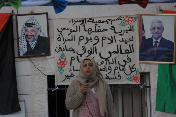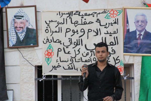 قامت جمعية الاسراء الخيرية مساء يوم الاحد ممثلى بإدارتها بالإشراف على حفل تكريم للأمهات تقديراً واحتراماً لمكانة المرأة في يومها العالمي ويوم الام وذلك في ساحة الجمعية الذي يقع وسط مدينة اريحا وقد تخلل الاحتفال أنشطة ترفيهية وأسئلة وأجوبة وأناشيد وشعر يخص الام الفلسطينية .