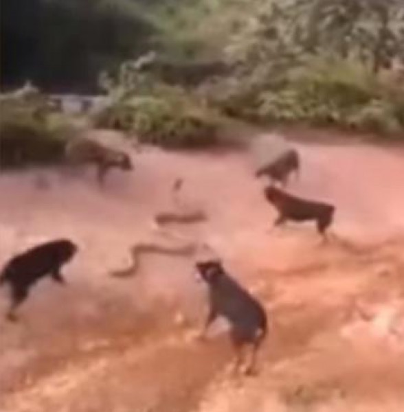 أفعى ضخمة تحاول النجاة من بين أنياب خمسة كلاب